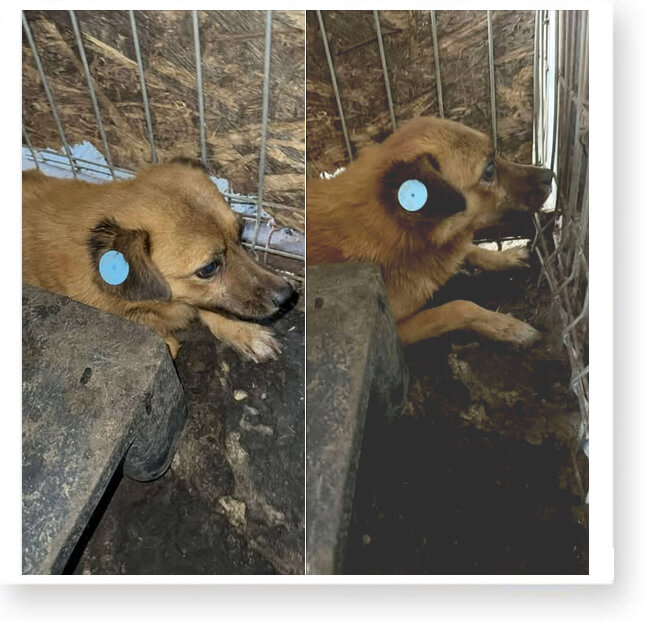 Der Boden ist vom Urin feucht, überall liegen Kothaufen. Die Hündin ist den Tierschützerinnen gegenüber freundlich, etwas schüchtern.