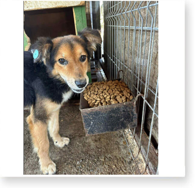 Hier bekommt die ausgesprochen freundliche Hündin ausreichend Futter, so, dass sie genug Nahrung für die Welpen hat und diese eine Überlebenschance haben.