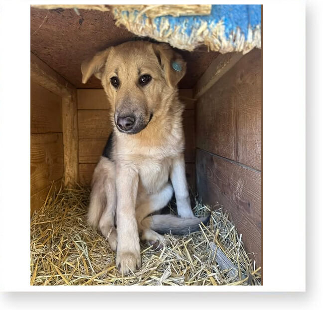 Findus liegt eingeschüchtert in der Hütte, er zittert am ganzen Körper und beobachtet die anderen Hunde, Findus will seine schützende Hütte nicht verlassen. Der hübsche Rüde hat richtig erkannt, dass es für ihn hier schnell gefährlich werden kann.