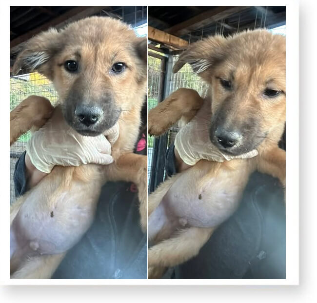 Suki ist seit kurzem mit seinen Geschwistern im öffentlichen Shelter. Dies ist ein Ort, an dem Welpen nur sehr schlechte Überlebenschancen haben, denn bei der Zusammensetzung der Hunde wird nicht auf die Größe oder das Alter der Hunde geachtet.